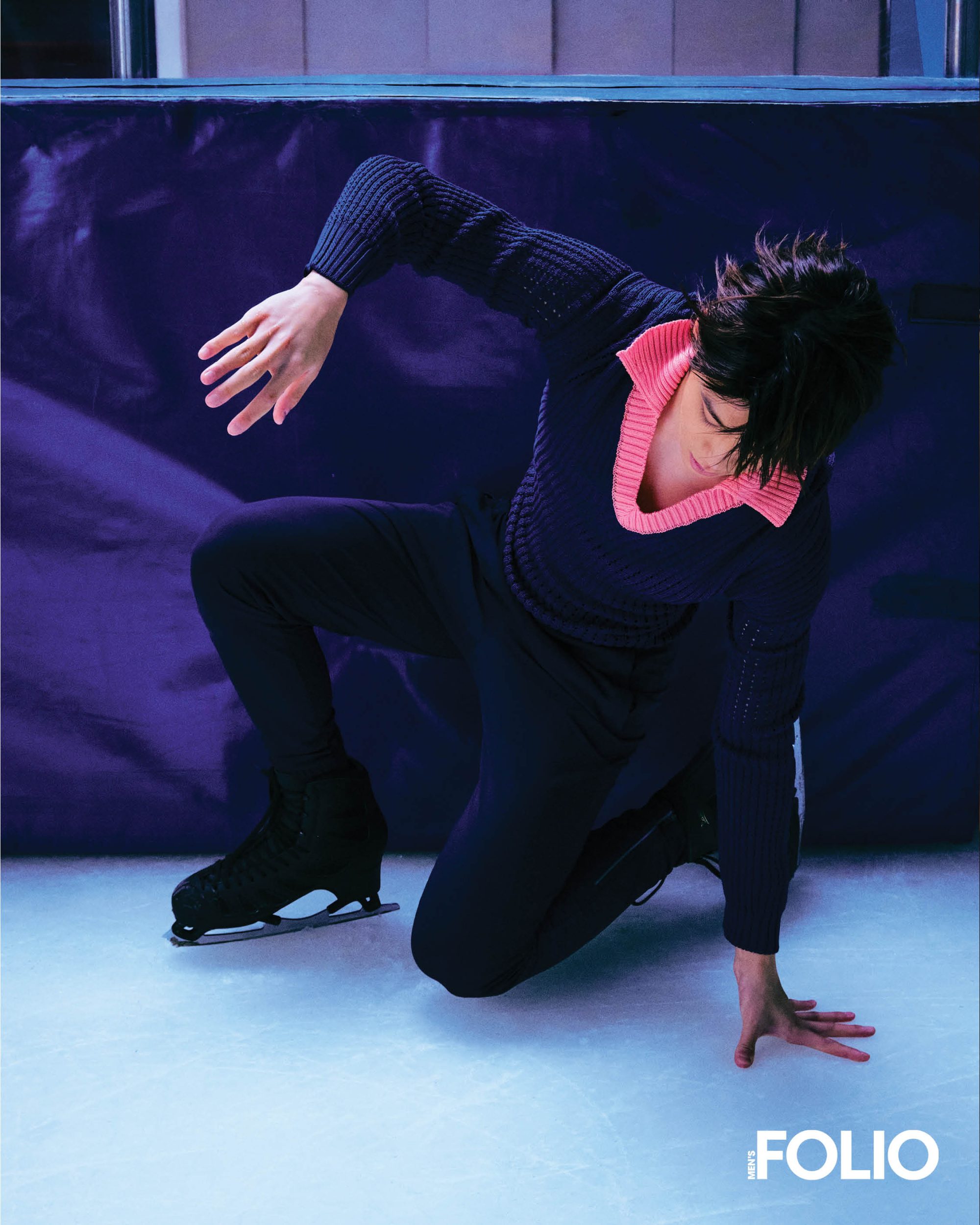 Sweater, shirt, shorts, Dior; Socks, ice skates, Ze Zeng’s own