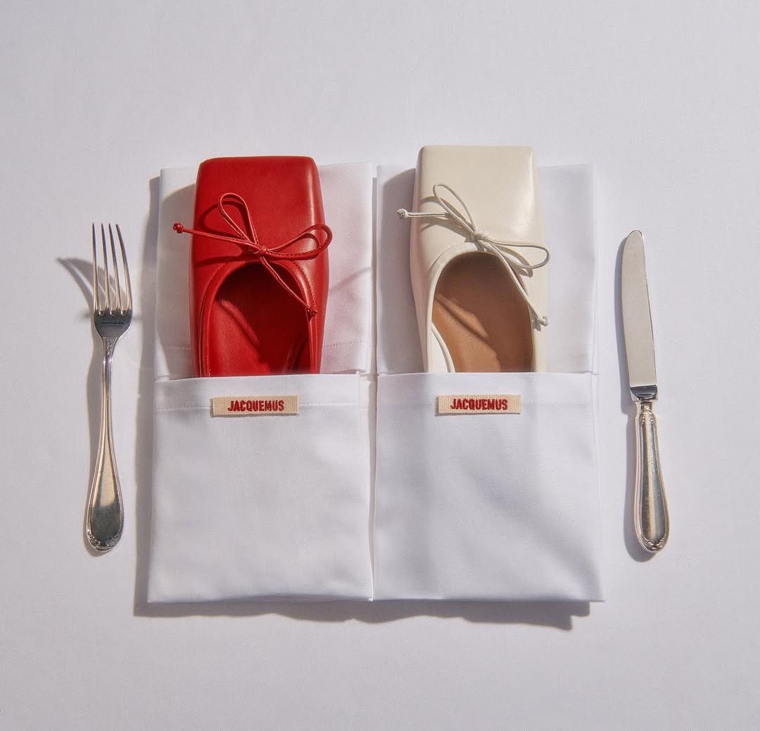 Beyond its comical ideas and pastel colour palette, food has long been a recurring theme for Simon Porte Jacquemus’ namesake label. The brand has featured a pair of gilded croissant earrings next to a stack of butters, the Chiquitos bag atop a pile of plates, and the ballet flats styled as cutlery — all under the campaign titled “A Table!”.