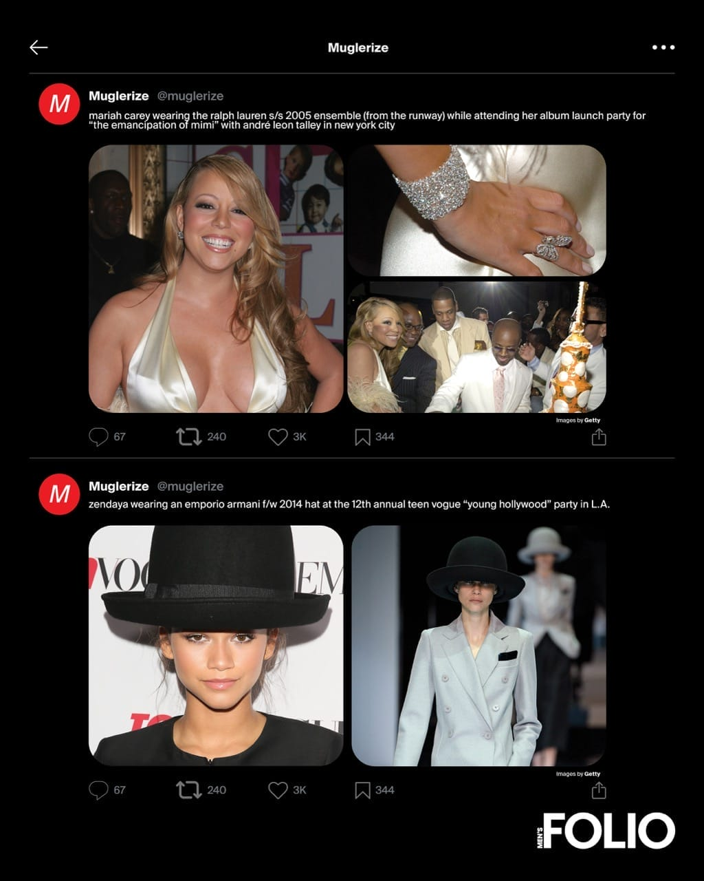 In one tweet, he identifies the Peter Dundas for Pucci dress NeNe Leakes wore in Season 6 of Real Housewives of Atlanta. “You look fabulous,” said Kenya Moore. “You don’t,” Leakes snaps back. In another tweet, he shares a photo of Mariah Carey on the set of Honey, wearing a little black dress next to an image from the original runway.