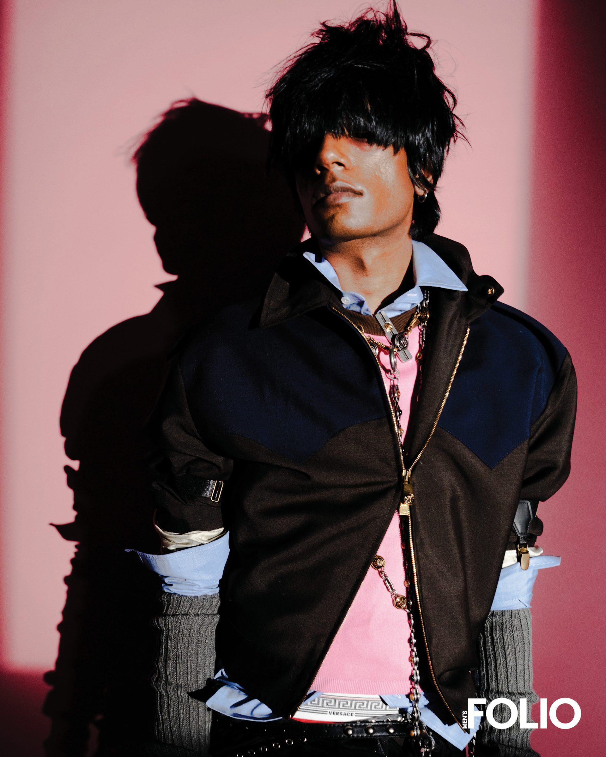 pin, all Versace; Shirt, sweater, belts,