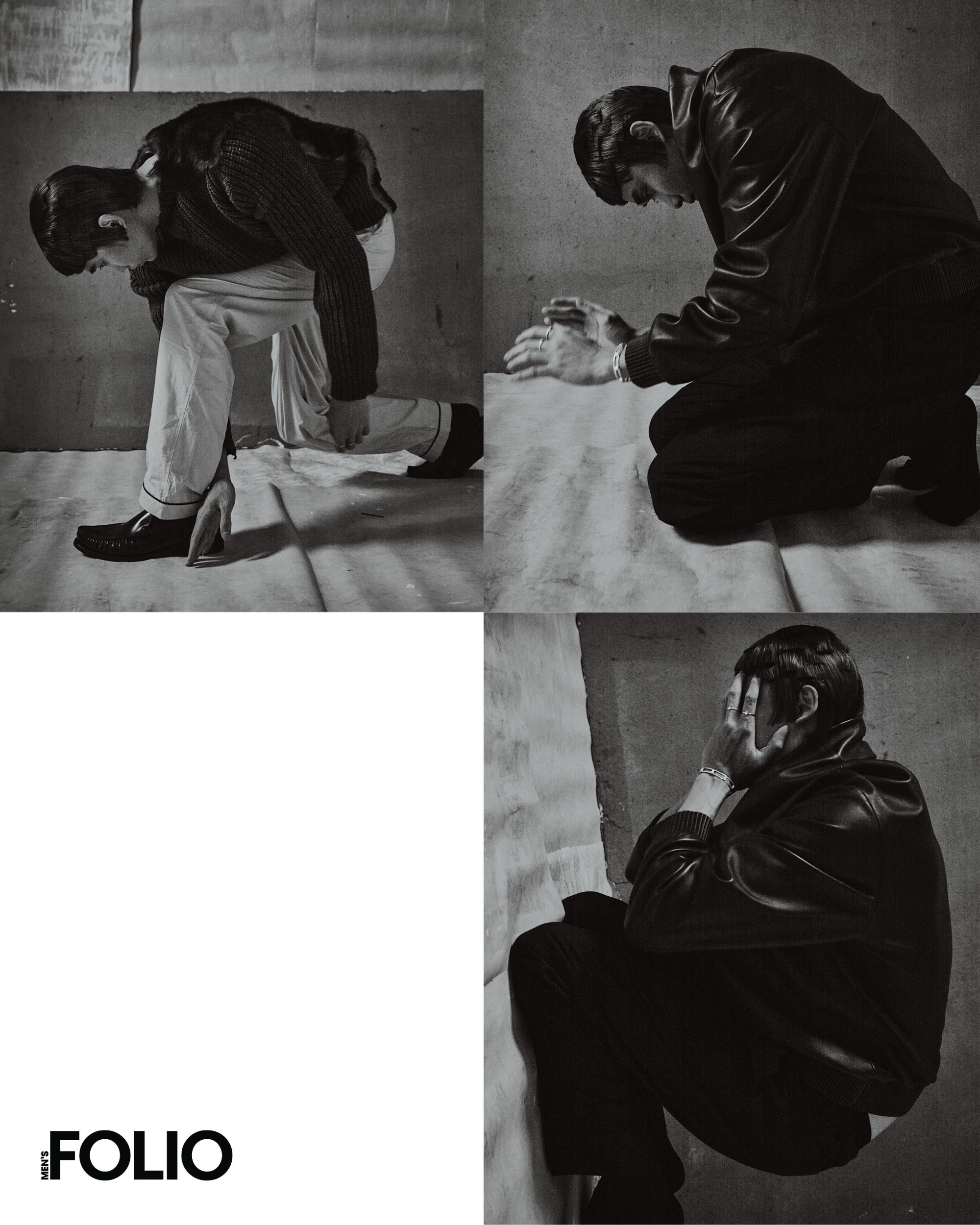 (Right) Jacket, pants, all Dior Men; Wulu white gold rings with diamonds, Wulu Eternity white gold bangle with diamonds, all Qeelin