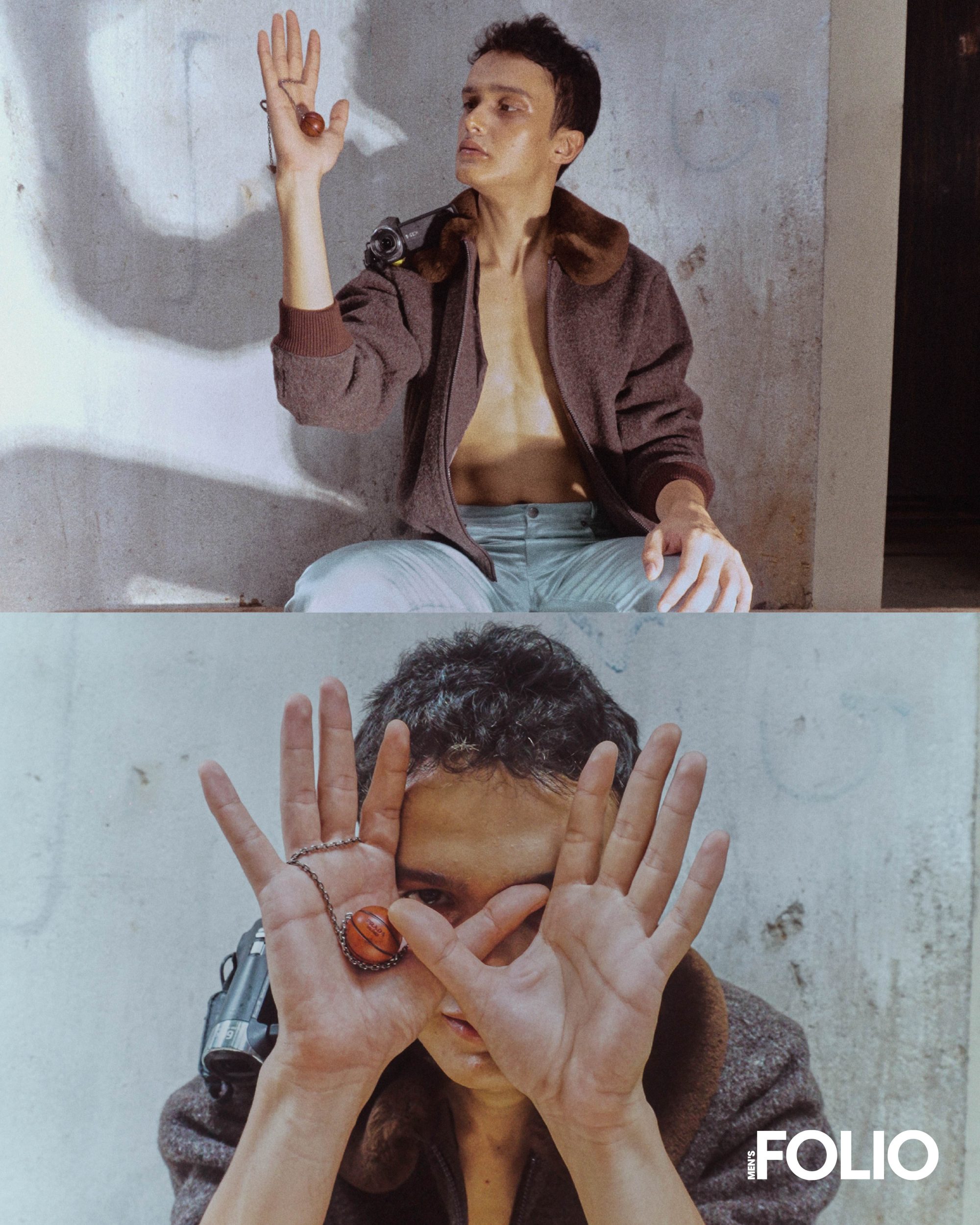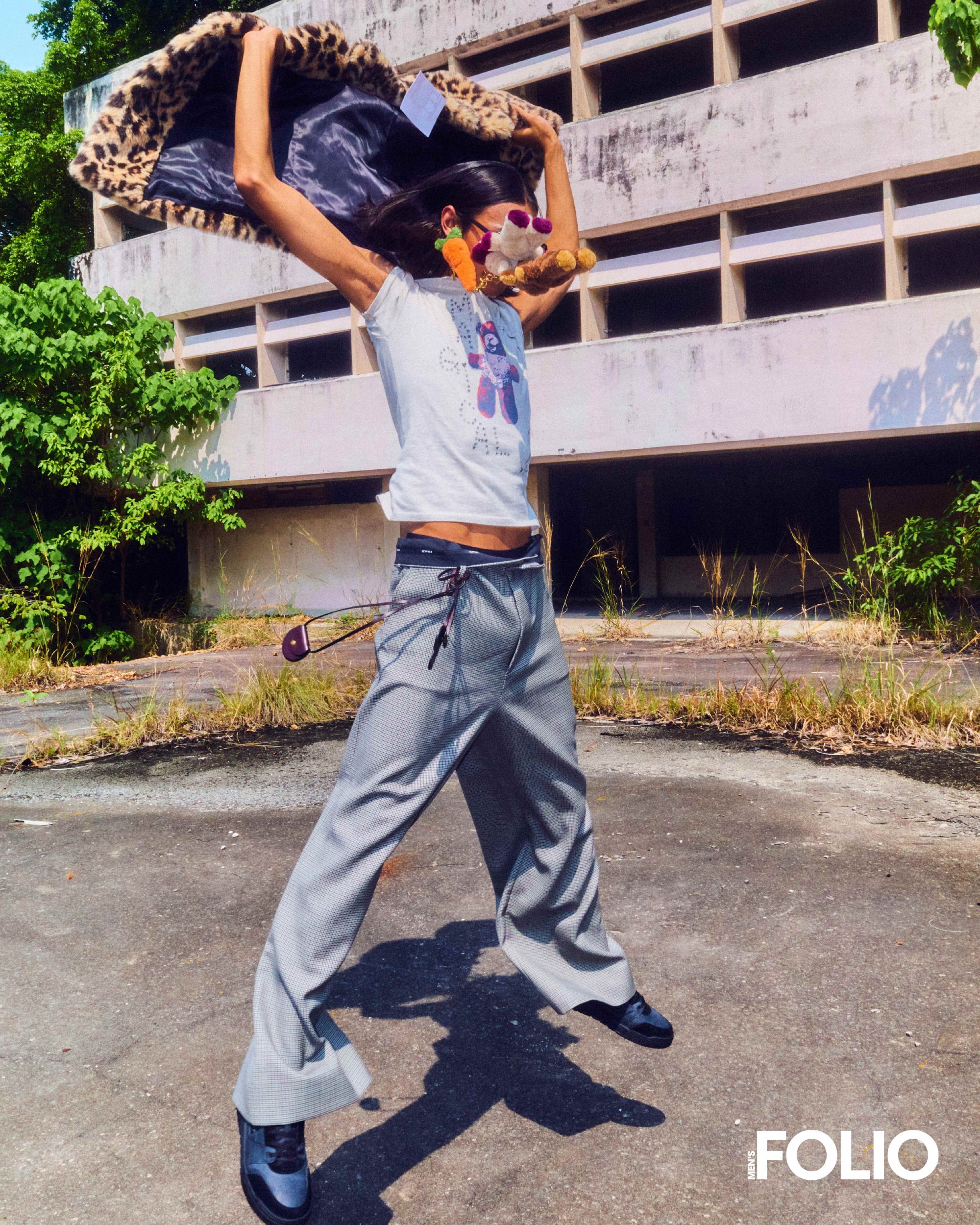 Jacket, T-shirt, pants, bag charms (worn around the collar), neck pouches (worn around the pants), sneakers, all Coach; Sunglasses briefs, Ridzman’s own