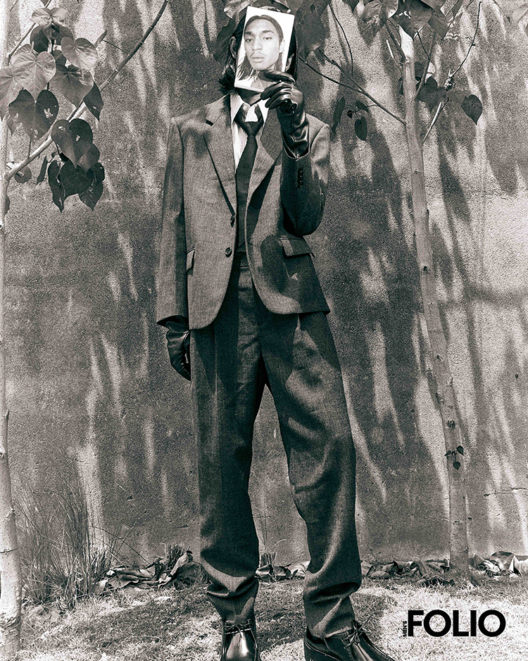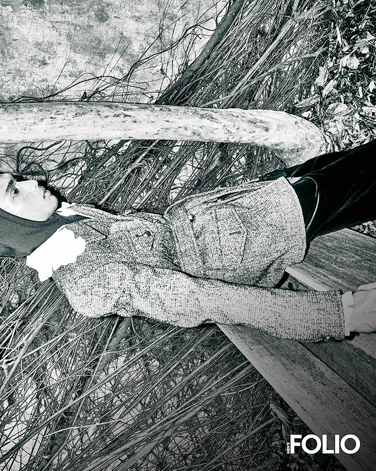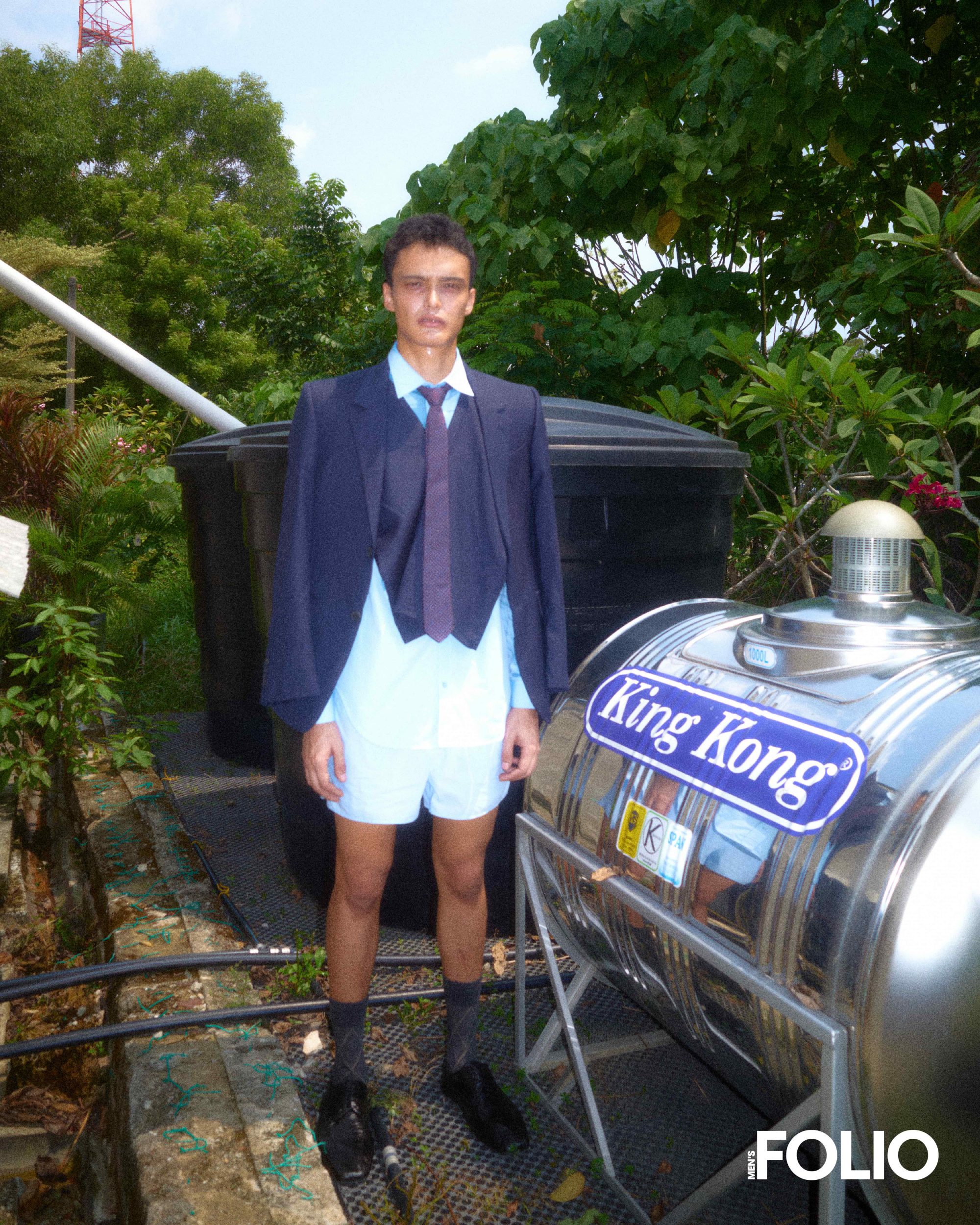 Jacket, shirt, pants (worn as vest), tie, shoes, all Balenciaga; Shorts, socks, Stylist’s own